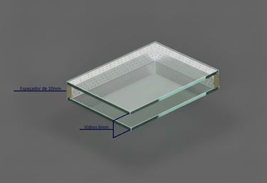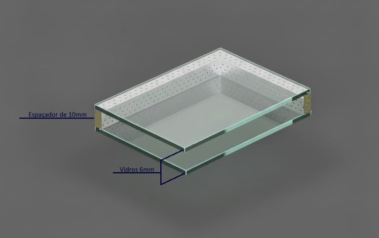 Vidro insulado com desempenho termoacústico, composto por duas lâminas de vidro de 6 mm separadas por uma câmara de ar de 10 mm. Essa configuração cria uma barreira eficiente para reduzir variações térmicas e atenuar ruídos leves.